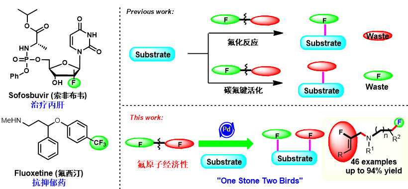 虽然氟元素广泛存在自然界中,但是其主要是以CaF2(萤石)的形式存在,含氟有机化合物及其有限,因此,人工合成含氟有机物越来越得到化学家们的高度,也是当前的前沿热点领域。近年来,含氟有机化合物的合成方法取得了显著的进展,大量新的引入氟原子和含氟基团的方法学以及新型的含氟试剂不断涌现,但是通产会产生当量的副产物。同时,碳氟键的活化越来越得到大家的关注,取得了很大的突破,但是氟原子由于作为了离去基团,因此在反应后不会进入产物中,氟原子经济性较差。