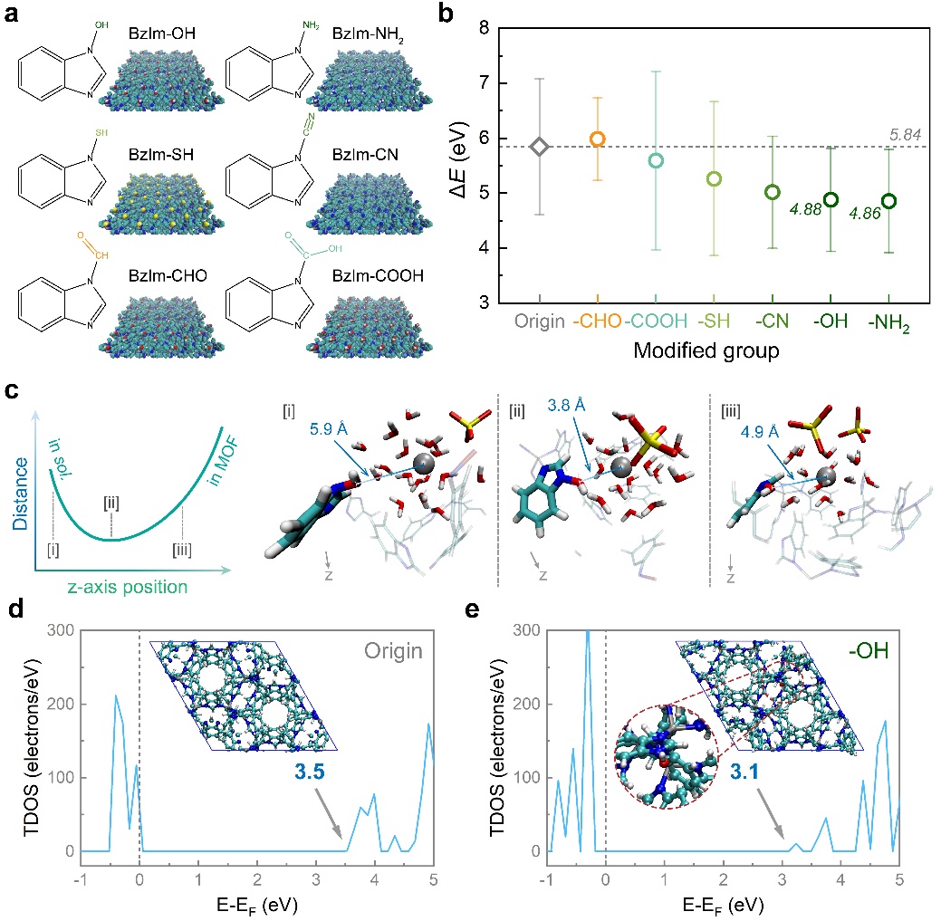 为了加速锌离子的迁移以提高电池性能,就需要降低脱水能这一额外能量消耗。考虑到亲水基团可以“抓住”锌离子溶剂化层中的水分子,课题组提出了在ZIF-7表面修饰亲水基团来降低脱水能的策略,经过自由能、态密度计算,研究发现修饰-OH、-NH2基团可以降低总脱水能约1eV并提高导电性。