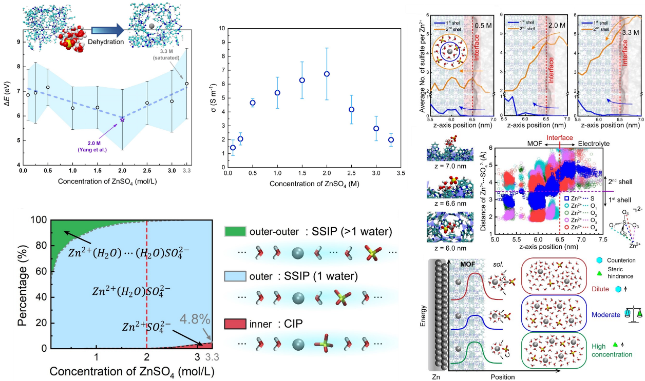 课题组发现,大量实验研究采用2 M浓度的ZnSO4电解液,然而选择这一浓度背后的微观机制尚未被揭露。通过自由能计算,课题组发现2 M浓度时锌离子迁移过膜的总脱水能最低,证实了该浓度下Zn2+的扩散速度优势。通过对电解液的溶液结构分析发现,该浓度的电解液具有相对最高电导率和最均匀离子对的分布。进一步跟踪统计发现Zn2+从电解液迁移至膜-液界面而后进入保护膜的过程中存在Zn2+与SO42-离子对重整机制。这三点共同构筑了AZIBs的“2 M定律”。