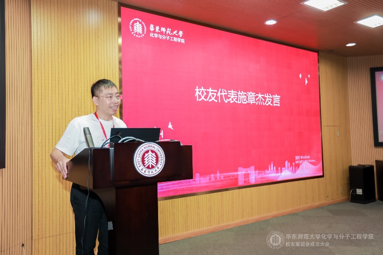 1992级化学专业本科生、复旦大学化学系教授施章杰作为校友代表发言。施老师用“柔美”“包容”和“关怀”三个关键词表达了对母校优美环境的喜爱,对求学历程中老师们的包容表示感谢,分享了自己求学时备受老师们关怀的暖心故事。他号召校友们反哺母校教育事业,为学院和学校高质量发展贡献力量。
