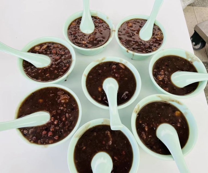 上午11点,参与活动的教职工齐聚华闵一楼。包饺子活动开始前,老师们人手一碗暖心腊八粥,在有说有笑中拉开了联欢活动的序幕。华闵餐厅的工作人员将饺子馅儿、饺子皮和其他包饺子工具依次摆放在餐桌上,老师们自由组队,准备大展身手。