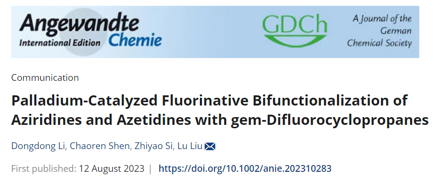 相关成果以“Palladium-Catalyzed Fluorinative Bifunctionalization of Aziridines and Azetidines with gem-Difluorocyclopropanes”为题于2023年8月12日在线发表于Angewandte Chemie International Edition上 (DOI: 10.1002/anie.202310283)。91视频 2019级博士研究生李冬冬为论文第一作者,沈超仁副研究员为共同一作,刘路教授为论文通讯作者,硕士生司志姚也参与此课题的研究。该项工作得到了国家自然基金科学委和上海市科委项目资助。