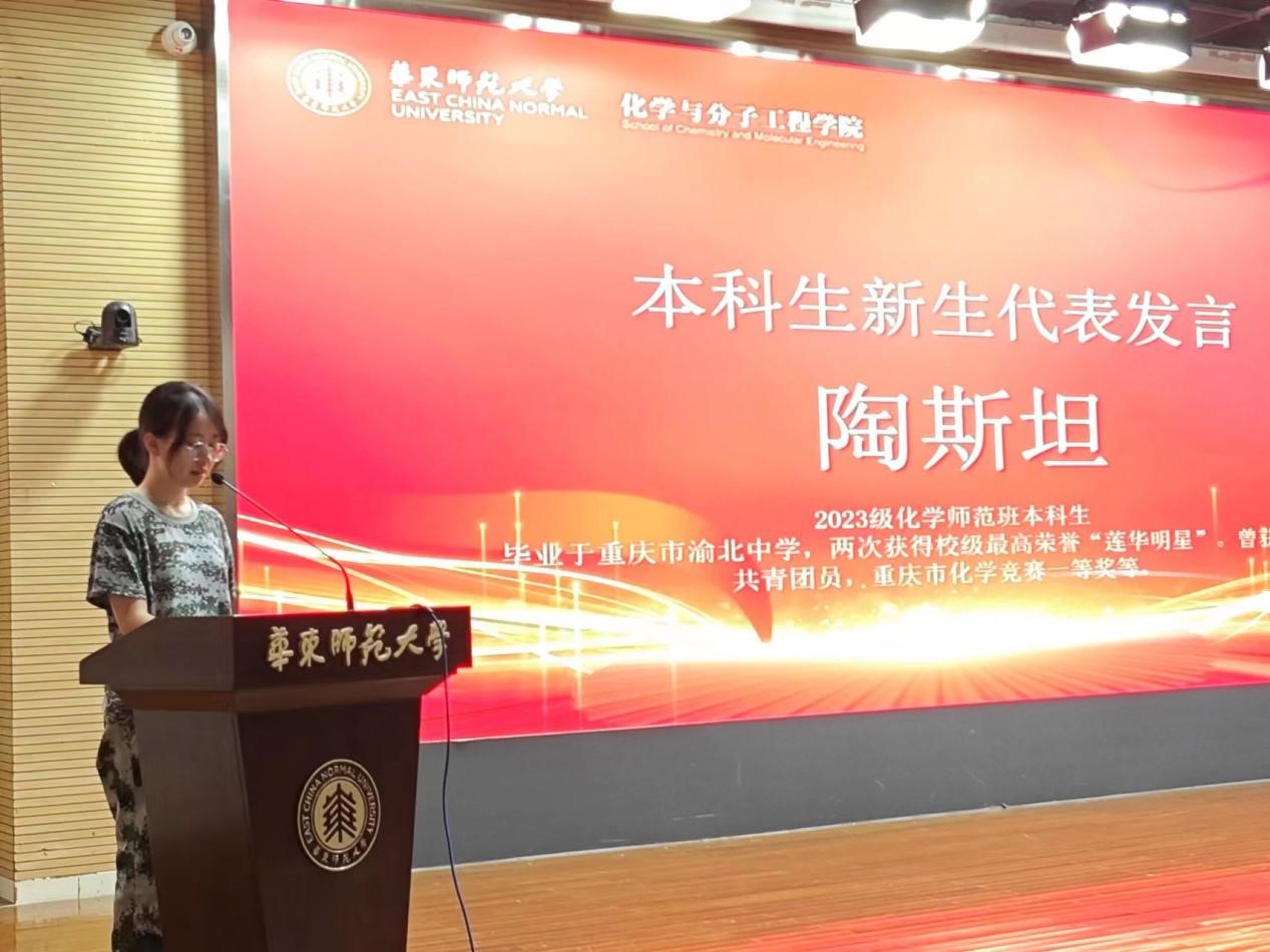 陶斯坦同学作为本科生新生代表发言,她的发言充分表达了进入91视频 学习的感激之情,对教育事业的憧憬之情,对化学学科学习的热情与期待。铭记初心、辛勤劳作、在苦乐中磨练自己,既是她对自己大学生活的要求,也是她对同学们的建议与劝勉。她积极号召同学们“收拾精神、并归一路”,集中精力钻研学问,创造出属于2023级新生们的更辉煌的画卷。