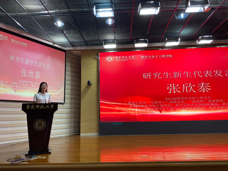 张欣泰作为研究生新生代表发言。她讲到,回顾考研的日子,并不轻松却值得回忆,希望在这个充满收获的季节,在华师大开启无限可能的人生新篇章。爱在华师大,她赞美和感激华师大安心又舒适的学习生活环境,丰富充实的学术氛围。最后,她祝愿同学们成为自由而全面发展的人才,在华师大遇见更好的自己!