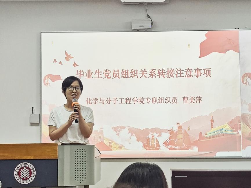 专职组织员曹美萍对毕业生党员组织关系转接的原则、流程、注意事项进行讲解,强调毕业生党员要强化党员组织意识,高度重视严肃认真做好组织关系转接。