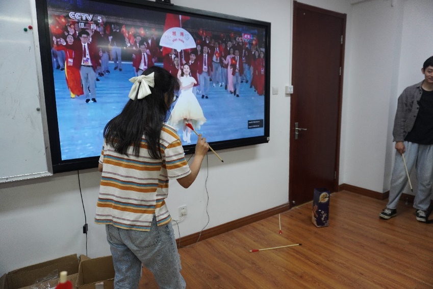 “对酒当歌,人生几何?”在“月下猜歌”环节,现场响起了美妙的音乐,同学们侧耳倾听,在自己的“小曲库”中找寻答案。参与活动的同学们争前恐后地举手抢答,现场的笑声、欢呼声汇聚成了一支更加美妙的乐曲。