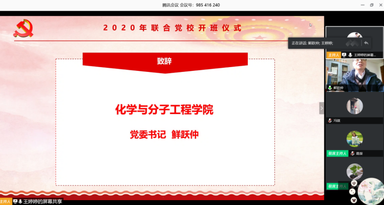 化学院党委书记鲜跃仲代表七个院系党委致辞,他表示,党校学员一定要认真学习,不断提高思想理论水平,各学员之间也要互相学习,共同进步;学员要时时刻刻以党员标准严格要求自己,在疫情期间,更要发挥党员的先锋模范作用;要严守纪律、开拓进取、挑战自我,做到“知行合一”。鲜老师也预祝党校学员早日成为党组织中的一员,同共产党人一起,为共产主义事业奋斗!