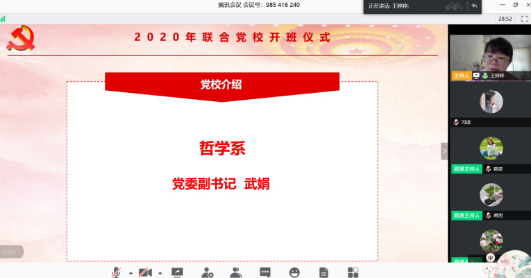 哲学系党委副书记武娟对党校培训内容和培训要求做了介绍。她向学员们讲解了本次党校的教学计划和安排,强调了学习要求和考核范围,并鼓励同学们勤于思考,努力学习党史党建的相关理论,坚定共产主义理想和信念,严格要求自己。