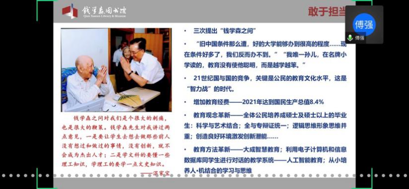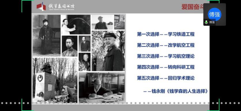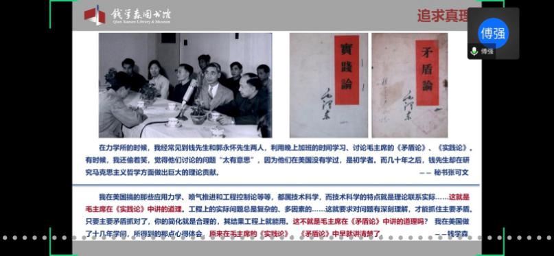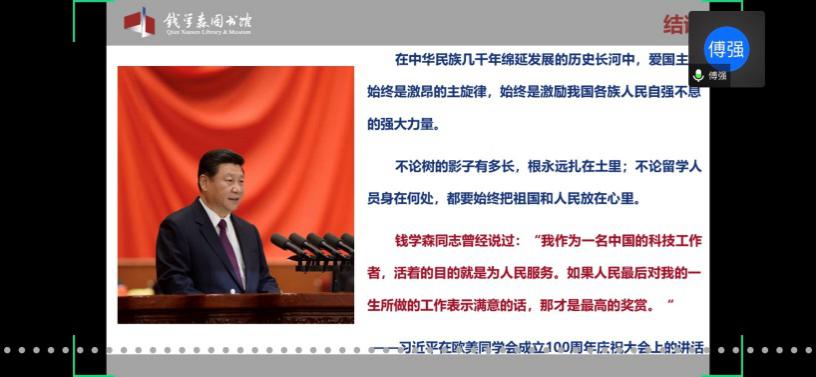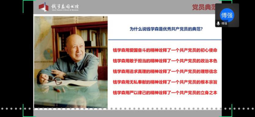 馆内基本展览分为“中国航天事业奠基人”、“科学技术前沿的开拓者”、“人民科学家风范”和“战略科学家的成功之道”四个部分。在傅老师的带领下,学员们通过网络360°全景参观了钱馆,领略了作为优秀共产党员的钱学森先生的高贵品质,理解了“不忘初心,牢记使命”的深刻内涵。傅老师也欢迎大家在疫情结束后,到华山路1800号钱馆实地参观。