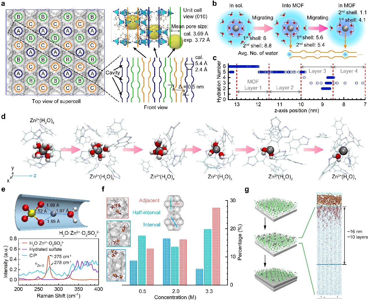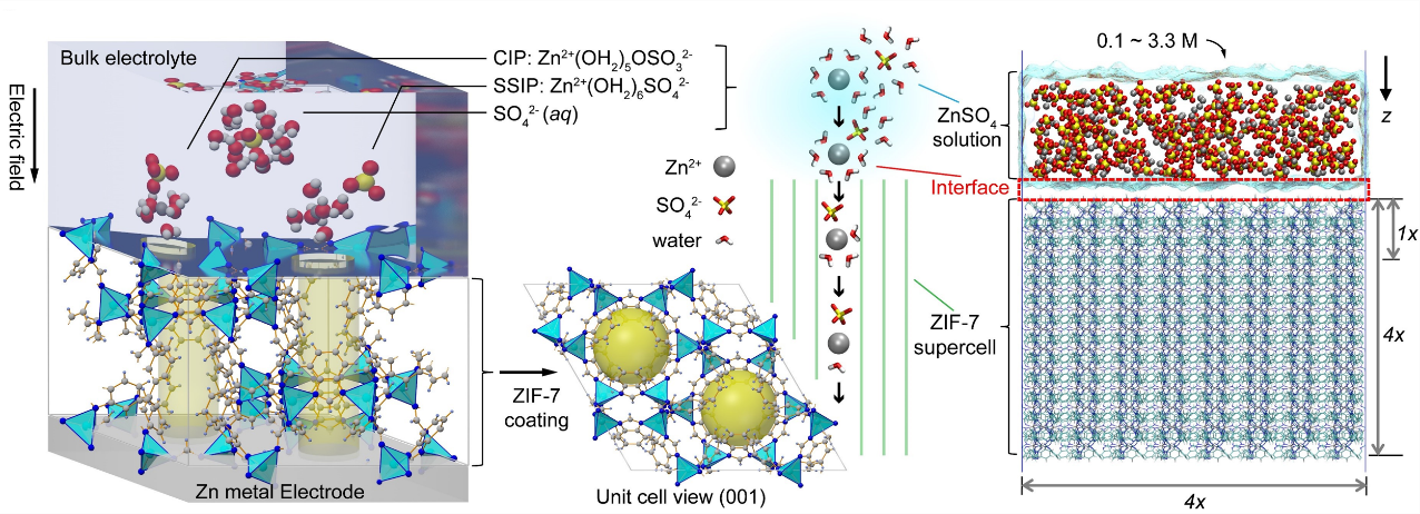 近日,91视频 的何晓教授和杨金荣副研究员团队聚焦这一底层机制,以ZnSO4电解液和沸石咪唑酯骨架ZIF-7负极保护膜为概念验证,使用理论计算模拟系统探讨了其电解液结构,揭示了溶剂化水合锌离子通过膜层逐步脱水的机理,并据此提出了降低膜厚度至~16 nm和在ZIF-7表面修饰亲水基团来降低脱水,加速锌离子扩散的策略。相关工作在线发表在化学领域顶级期刊《德国应用化学》上(Angew. Chem. Int. Ed. 2023, e202307274),并被评为VIP文章(Very Important Paper)。