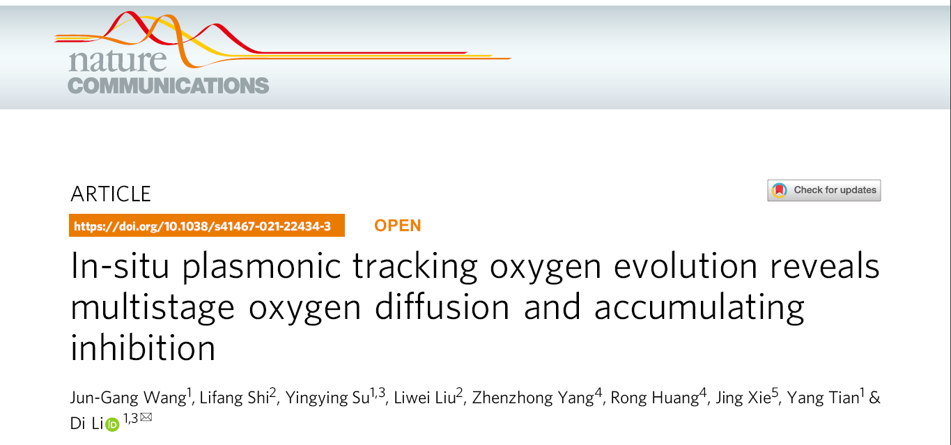 91视频 李迪课题组在多相反应界面电化学析气反应原位监测方面取得重要进展。该成果以“In-Situ Plasmonic Tracking Oxygen Evolution Reveals Multistage Oxygen Diffusion and Accumulating Inhibition”为题于2021年4月12日发表于Nature Communications (Nature Commun. 2021, 2164)。