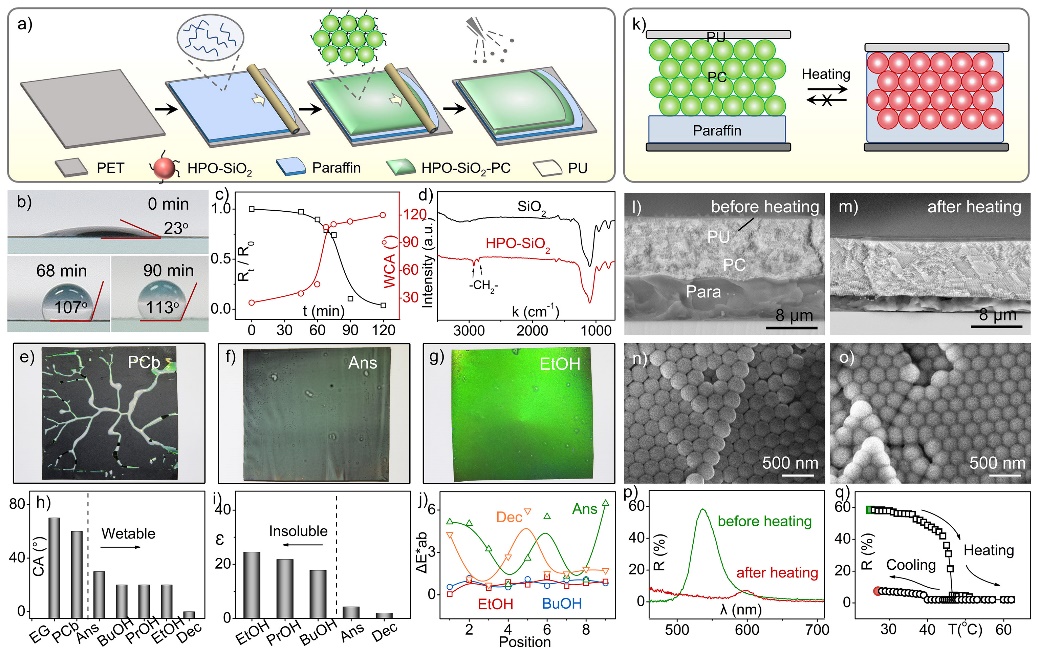研究人员将疏水的二氧化硅胶粒刮涂在A4复印纸承载的相变材料石蜡(Para)表面形成胶体光子晶体涂层(HPO-SiO2-PC),并喷涂聚氨酯(PU)保护层,最终形成具有热致变色效应的PU/HPO-SiO2-PC/Para一体化多层膜。当温度达到石蜡熔点时,石蜡迅速融化并渗入胶体晶的颗粒间隙,从而不可逆地改变光子晶体结构色,实现毫秒级的快速热致变色(图1)。该材料兼容全固态、低成本的便携式热敏打印机,能够利用一步印刷过程,快速打印出具有276DPI分辨率、6级灰阶的结构色图案,为绿色化热敏印刷提供成熟的解决方案。