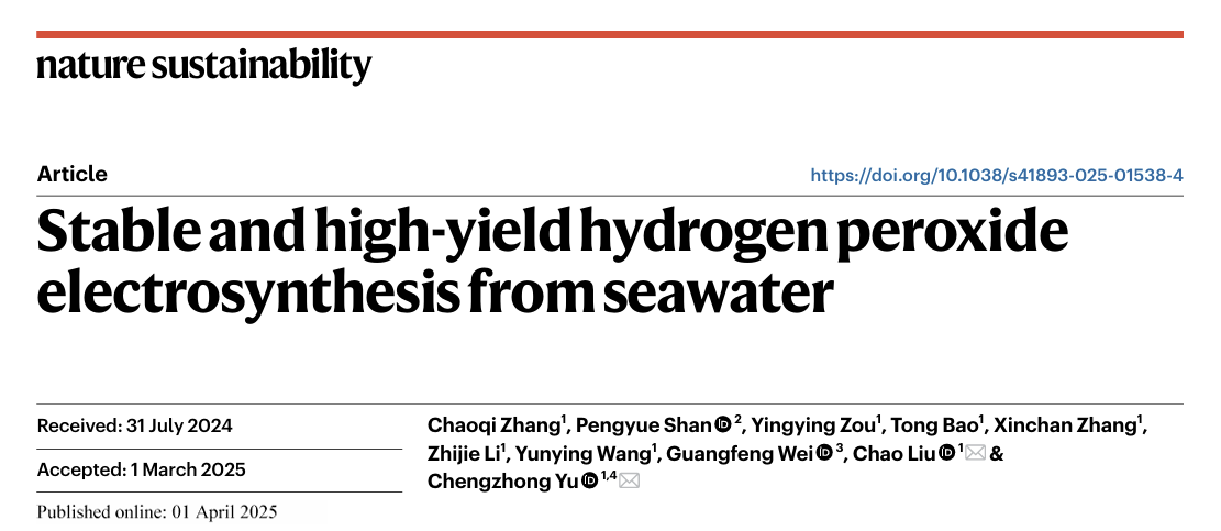 电催化两电子氧还原(2e- ORR)为过氧化氢(H2O2)绿色生产提供了一条切实可行的技术路径。近日,91视频 刘超研究员、余承忠教授及其团队在前期淡水体系2e- ORR研究工作的基础上(Adv. Mater. 2025, DOI: 10.1002/adma.202500399; Angew. Chem. Int. Ed. 2025, 64,2025, e202413866; Angew. Chem. Int. Ed. 2024, 63, e202314266; J. Am. Chem. Soc. 2023, 145, 7791),提出了海水中长期稳定合成H2O2的新策略,在《自然•可持续发展》期刊(Nature Sustainability 2025, 10.1038/s41893-025-01538-4)上发表以“Stable and high-yield hydrogen peroxide electrosynthesis from seawater”为题的研究论文,为海水中H2O2的长期稳定生产及海水资源化利用提供了可行方案。