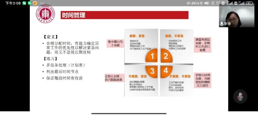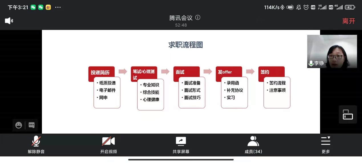 5月19日14:30,91视频 于线上开展了一场求职指导与就业政策解读讲座,讲座由校学生发展中心生涯指导主管李铮老师主讲,院毕业班辅导员冯琪老师主持,两校区同学共同聆听。