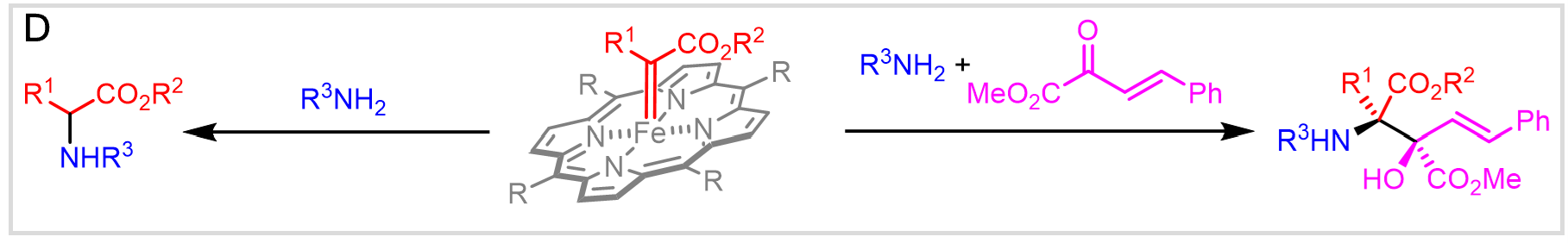 邢栋课题组长期以来致力于发展绿色高效的催化新策略及药物合成应用。在仿生催化方向,采用铁卟啉催化实现了系列基于卡宾转移的烷基化反应。在本研究中,他们实现了系列从给体/受体重氮化合物出发的铁卟啉卡宾配合物的合成、表征及该类配合物在卡宾转移反应中的应用。基于对给体/受体重氮化合物结构的详细优化与调整,课题组从吗啉取代的重氮酰胺出发,最终制得了稳定的铁卟啉卡宾中间体并通过单晶确证了其结构(图C)。所合成的系列给体/受体铁卟啉卡宾配合物在芳香胺和脂肪胺的烷基化反应及相关的亲电串联反应中都表现出了良好的活性(图D),为该类转化中铁卟啉卡宾中间体的参与提供了直接证据。除此之外,该类铁卡宾配合物在胺类化合物的卡宾转移反应中表现出了优异的催化活性,为该类转化牵涉到双卡宾中间体历程提供了佐证。