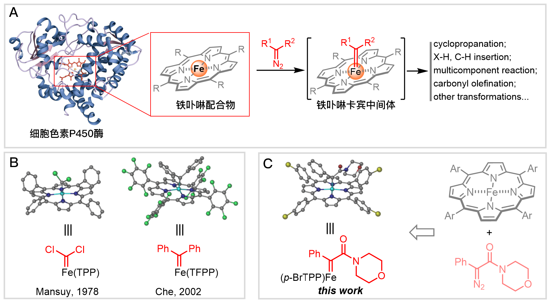 铁卟啉是生物体内众多氧化还原酶例如细胞色素酶P450(CYPs)的活性中心。近年来,P450及其改造酶作为高效的生物催化剂,被广泛的应用于卡宾转移反应中。在此基础上,铁卟啉及其衍生物、替代物所催化的卡宾转移反应也受到了化学家的广泛重视并成为有机合成采用的高效策略之一,在环丙烷化、烷基化、多组分反应、羰烯基化等多种类型的有机反应中得到广泛应用(图A)。铁卟啉卡宾(IPC)被认为是这类卡宾转移反应中间体,对铁卟啉卡宾的结构和反应活性进行研究不仅能够深入理解该类转化的机理,且有助于理解生物催化的卡宾转移反应的机制。因此,铁卟啉卡宾的结构及反应性能研究是铁卟啉化学的研究前沿之一。铁卟啉卡宾的反应活性与其结构息息相关。卡宾碳由于通常带部分正电,供电子取代基能够稳定卡宾中间体,而吸电子取代基会使其结构更不稳定。目前基于单晶结构所确证的两例铁卟啉卡宾配合物均为供电子卡宾,分别是由Mansuy课题组于1978年所报道的[Fe(TPP)CCl2]及香港大学支志明院士课题组于2002年所报道的[Fe(TFPP)CPh2](图B)。尽管在卡宾转移反应中,应用最为广泛的卡宾前体是反应活性较高的给体/受体重氮化合物,但给体/受体类型的铁卟啉卡宾配合物的结构和反应性研究较少,缺乏该类中间体参与反应的直接证据。