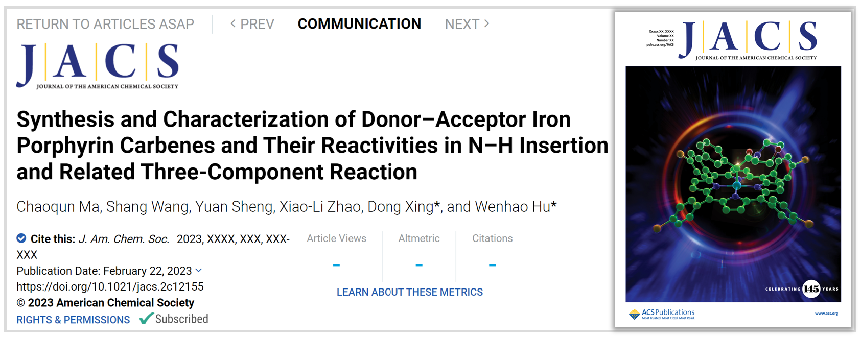 近日,华东师大91视频 邢栋课题组联合中山大学胡文浩教授团队,在铁卟啉催化的卡宾转移机理研究中取得进展。报道了给体/受体铁卟啉卡宾配合物的合成、表征及该类配合物在卡宾转移反应中的应用。证实了铁卡宾是该类反应的关键中间体,研究成果以“给体/受体铁卟啉卡宾的合成、表征及其在氮氢插入和相关三组分反应中的反应性能研究(Synthesis and Characterization of Donor−Acceptor Iron Porphyrin Carbenes and Their Reactivities in N−H Insertion and Related Three-Component Reactions)”为题,于2023年2月22日在《美国化学会志》(Journal of the American Chemical Society)上在线发表(10.1021/jacs.2c12155)并被选为封面文章。
