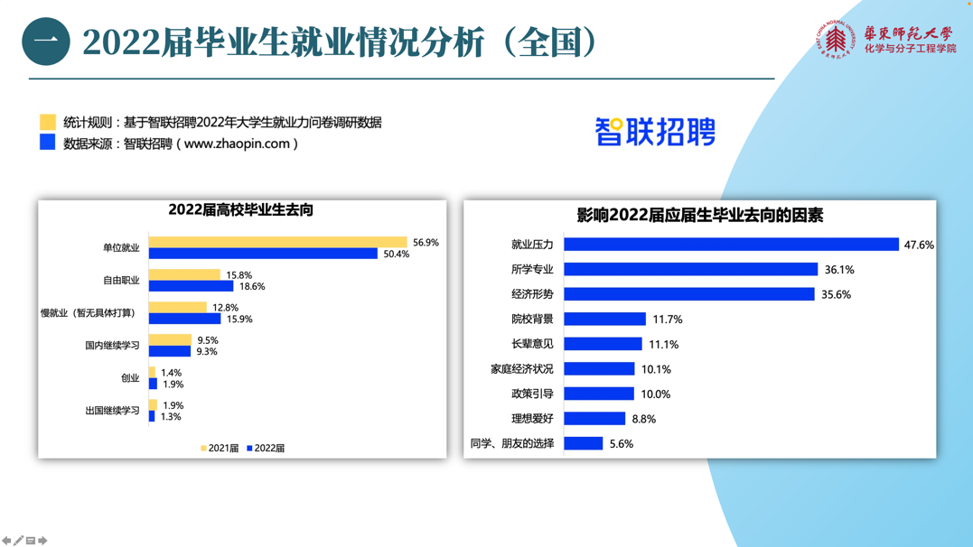 讲座的第一环节是2022届毕业生就业情况分析。王梦雅老师就全国毕业生的大数据,总结了影响应届毕业生就业去向的因素,分析了毕业生投递简历的主要渠道和经济因素对毕业生的就业期望的影响,并结合学院的毕业信息统计,向大家介绍了91视频 2022届毕业生的毕业去向。