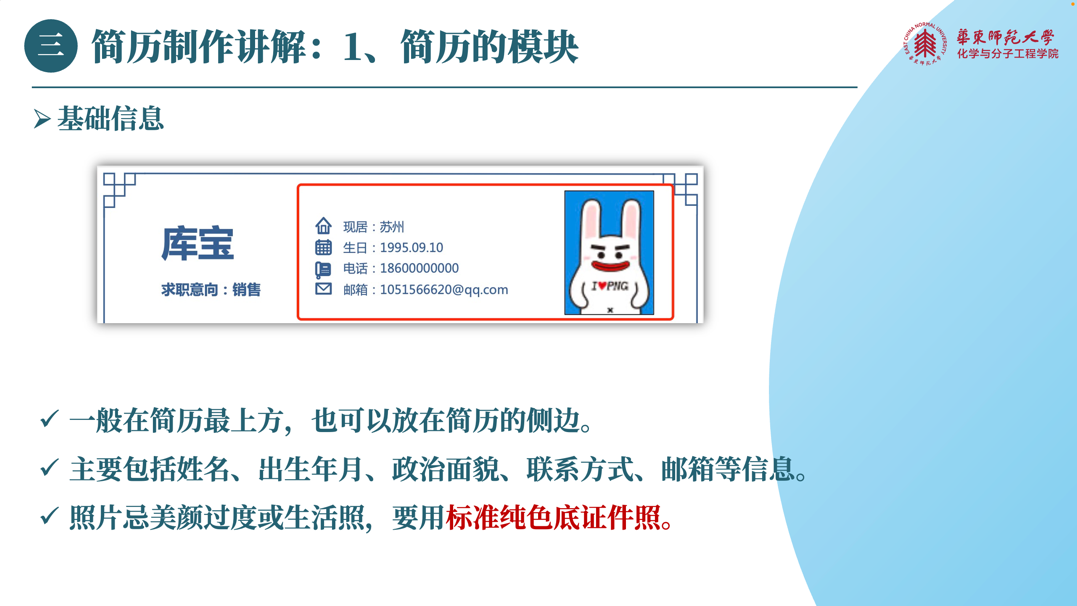 讲座的第三环节是简历的制作讲解。在这个环节,梦雅老师告诉大家要学会包装自己、展示自己、推销自己、看到自己的闪光点。梦雅老师从简历的模块入手,为大家详细讲解了一份完整的简历应该包括基础信息、求职意向、教育背景、校园实践、实习经历、荣誉奖励等模块,并依次介绍了各个模块应该如何措辞和呈现。此外,梦雅老师还为大家介绍了简历的正确格式和投递注意事项。