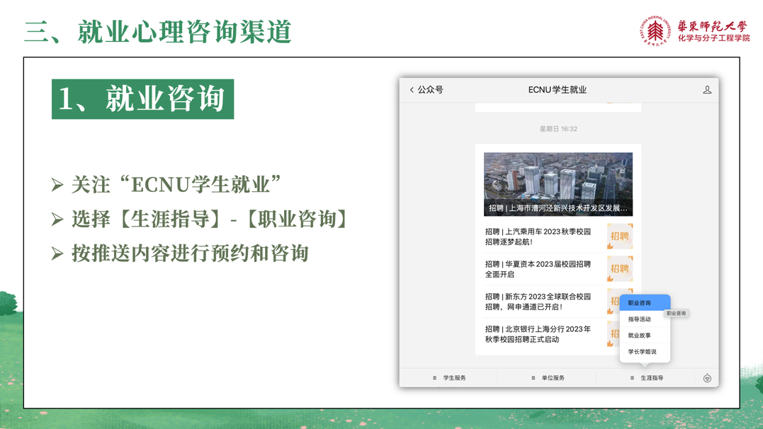 最后,王梦雅老师为同学们提供了几种就业心理咨询渠道。首先是学生职业发展中心为同学们提供的生涯指导和职业咨询,其次是心理健康教育与咨询中心为同学们提供的心理咨询,最后,王老师也欢迎大家积极主动与辅导员进行谈心谈话。