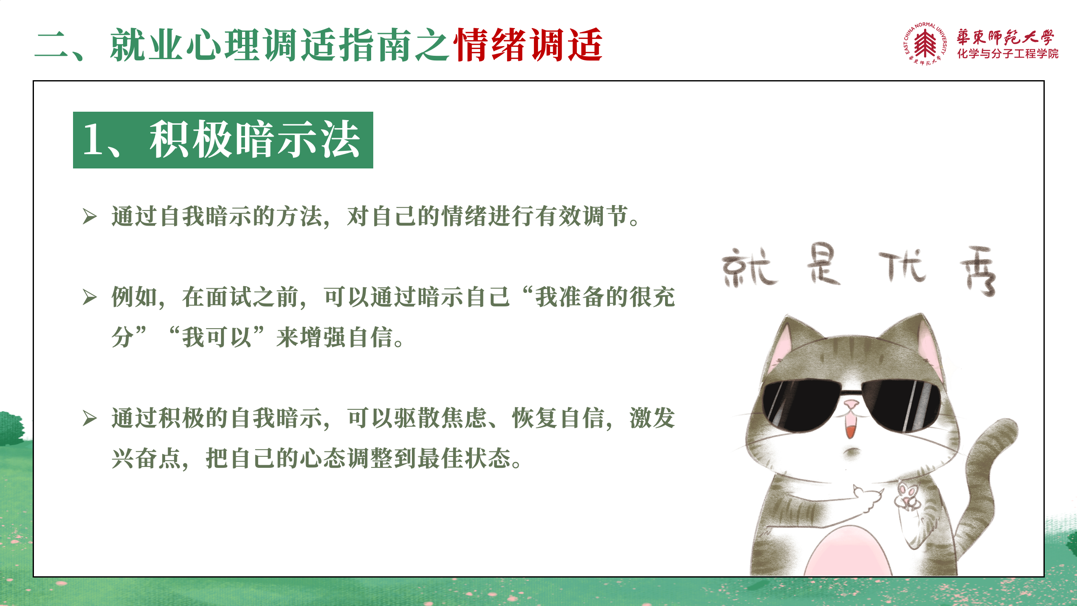 在第二个环节,王梦雅老师针对同学们可能遇到的就业心理困扰提出两种调适办法。一种是情绪调适,王老师带领与会师生一起学习了积极暗示法、注意转移法、理智分析法、放松训练法和合理宣泄法等情绪调适方法;另一种是行为调适,王老师告诉同学们要明确形势、找准定位,整合资源、发掘渠道,做好准备、主动出击,灵活机动、适时调整。
