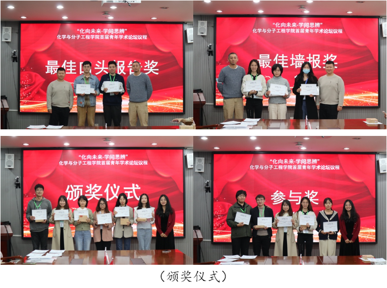 经过评审嘉宾热烈讨论,最终评选出“最佳口头报告奖”2名,“最佳墙报奖”3名,参与奖数名。2020级物理化学专业博士研究生徐恒和2019级有机化学专业博士研究生王宇获得“最佳口头报告奖”,2020级分析化学专业硕士研究生周雪、2020级分析化学专业硕士研究生陆申以及2021级有机化学专业博士研究生冯海娜获得“最佳墙报奖”。