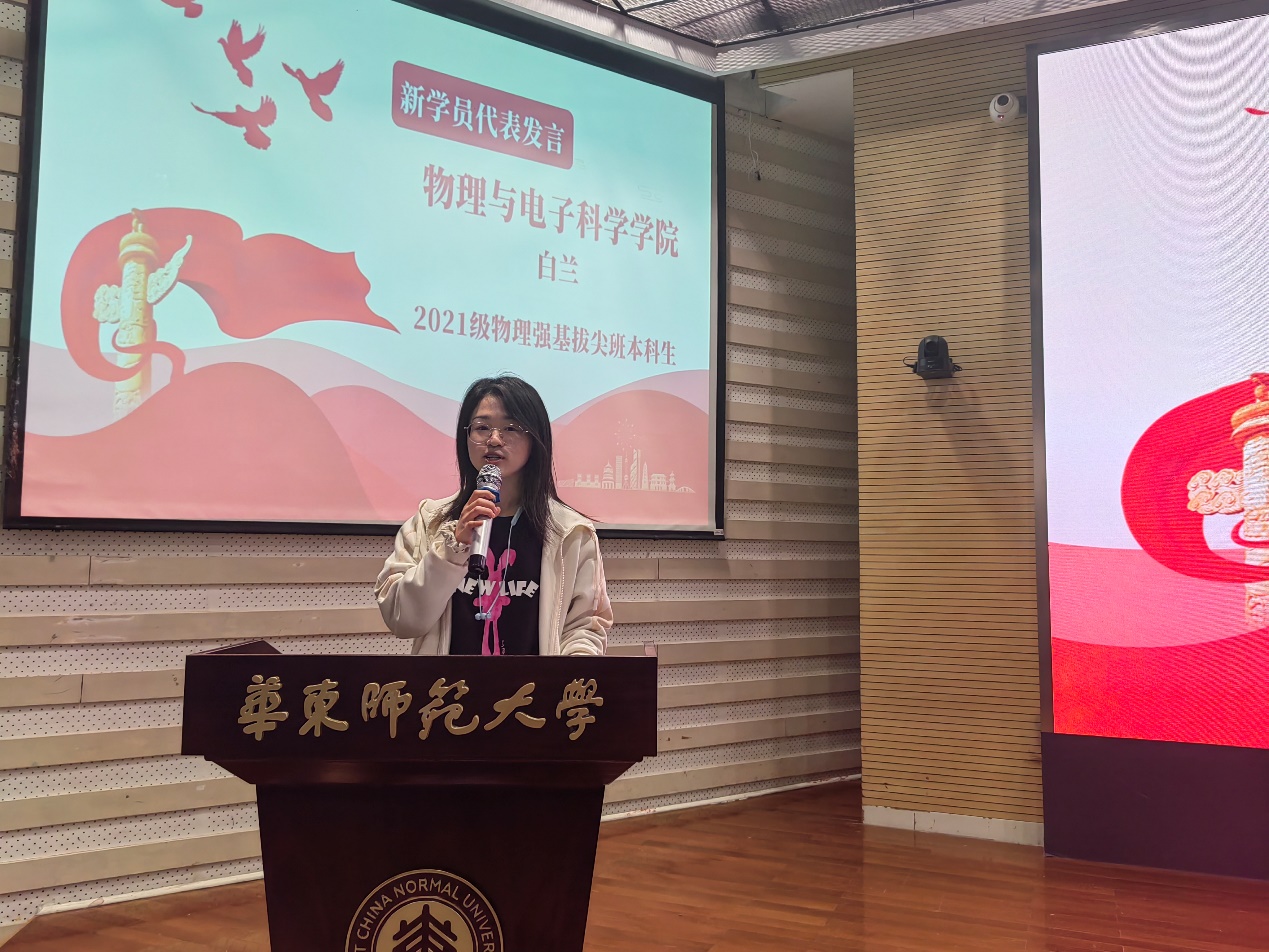 随后,哲学系2022级硕士研究生韩潘越作为老生学员代表发言,她认为,作为入党积极分子,提升党性修养是必修课,而参加党校培训正是提升党性修养的好机会,希望各位学员在接下来的党校学习中认真、踏实,学有所获。物理与电子科学学院2021级本科生白兰作为新学员代表发言,她认为,入党积极分子培训班的开办是党组织对学员们的政治素养和思想觉悟的培养,是党组织对我们的信任和重托,更是一次难得的学习机会,她对接下来的党校学习表达了信心和期待。