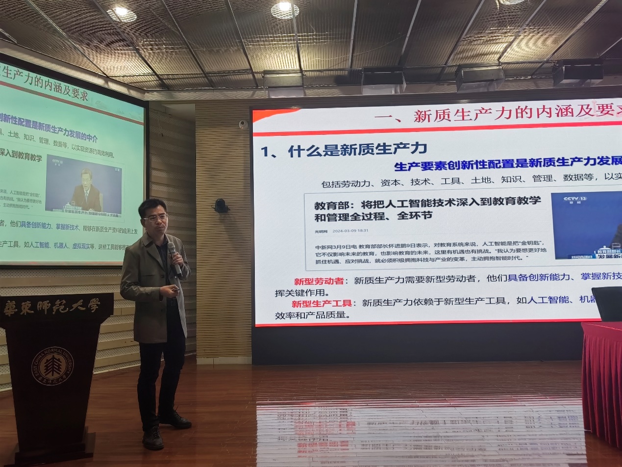 接着,91视频 挂职副院长、贵州六盘水师范学院化学与材料工程学院院长雷以柱教授为学员们进行首场讲座,报告主题为“深刻把握新质生产力的内涵及要求,为推动高质量发展贡献高校力量”。雷老师结合自身教学和科研的相关工作,深刻阐释了新质生产力的内涵及要求,以及高校在锻造新质生产力方面的应有之力。他特别讲到,高校是发展新质生产力的重要力量和关键路径,鼓励参训学员,心怀“国之大者”,抓住师大的宝贵环境,在学习科研和生活中提高自身综合素质和创新能力,做“与国家民族同呼吸共命运”的“强国一代”。