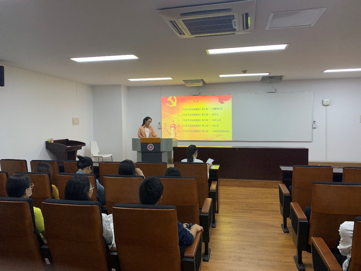 2020年9月21日晚,91视频 2018级研究生党支部在闵行校区化学楼135室召开了以“学习《习近平谈治国理政》第三卷”为主题的党日活动。党支部成员参加会议,会议由党支部第一小组主要负责人乔雨同志主持。