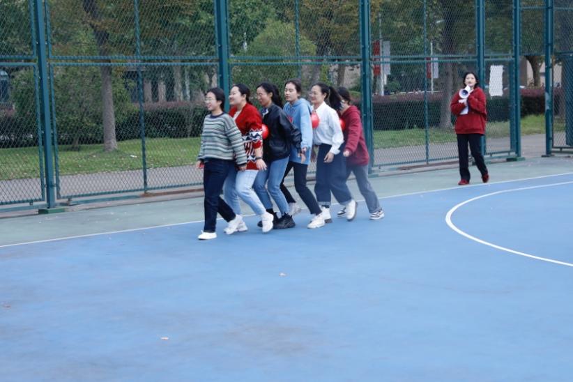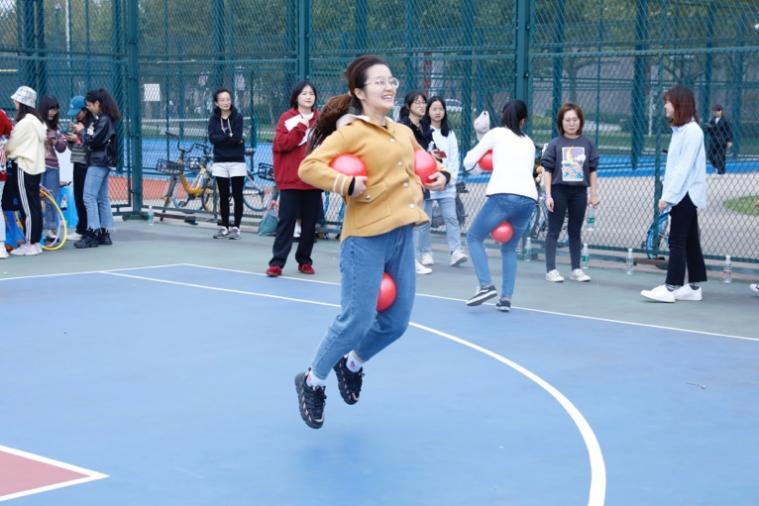 在“袋鼠跳”项目中,师生采用迎面接力形式,双脚套在袋子中跳跃前进,按完成时间进行排名,其中紫队一马当先,拔得头筹。