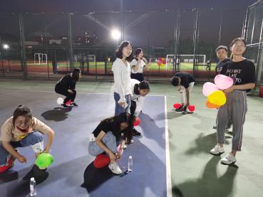 大家将早已准备好的气球牢牢系在脚踝上,个个精神抖擞,跃跃欲试……随着裁判员李晓峰的一声“开始”,同学们如离弦的箭一般冲到圆圈内踩气球,个个眉间都出现了紧张的“八”字形,满场都是“砰砰砰”气球被踩爆的声音。在只剩四人之后,圈子缩小,战况更加激烈。一番“战斗”后,出现了最终的胜利者。同学们的笑声回荡在操场上,噼噼啪啪的爆炸声萦绕在耳边,快乐的画面也永驻心间。